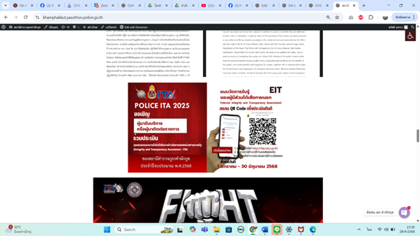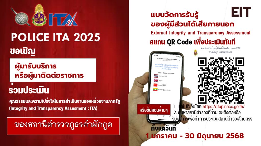 2)  แบบวัดการรับรู้ของผู้มีส่วนได้เสียภายใน (External Integrity and Transperency Assessment : EIT) เจ้าหน้าที่ที่มีหน้าที่รับผิดชอบ นำลิงก์ หรือ QR Code แบบวัดการรับรู้ของผู้มีส่วนได้เสียภายนอก EIT ของสถานีตำรวจ เปิดเผย ณ จัดให้บริการประชาชนที่มารับบริการ และพัฒนาการให้บริการ เพื่อความสะดวก รวดเร็วในการให้บริการ เริ่มตอบข้อคำถามได้ตั้งแต่บัดนี้ จนถึงวันที่ 30 มิถุนายน 2568